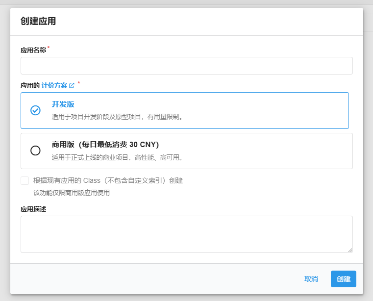 创建应用按钮,填写应用名称并选择开发版计价方案,点击创建按钮。