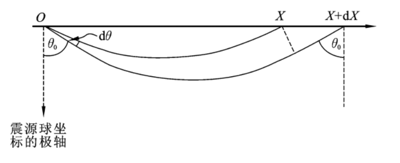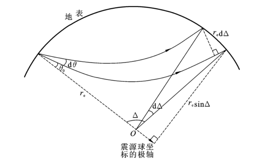 在震源处建立球坐标系(球极指向地球球心),设震源处的速度为 v0,射线出射角为 θ0。震源处的单位球面上的面元为