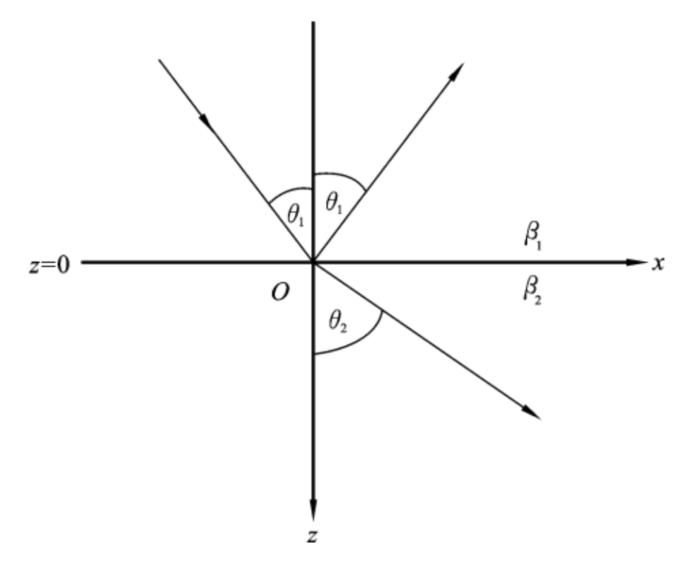 我们假设速度间断面是水平的,平面波在 x−z 平面内传播,并假设向下为 z 坐标的正方向。