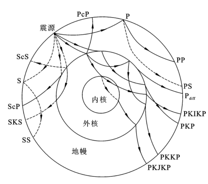 地震震相命名遵循 IASPE 标准,采用字母拼接方式描述射线从震源到接收器的完整传播路径。