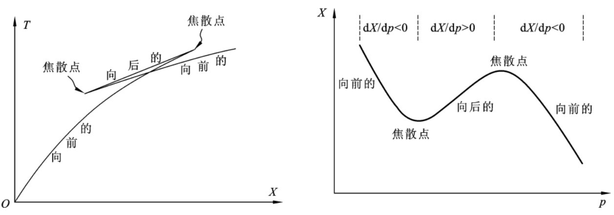 当射线进入一个速度比上层更快的高速夹层时,走时曲线会打折并出现三重线。此时走时就不再是震中距的单值函数,向前和向后的过渡点为走时曲线的尖点 (cusp),称为焦散点 (caustic)。