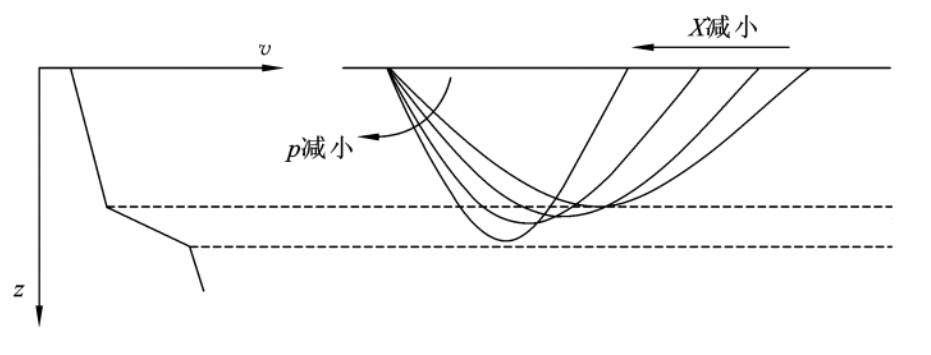 时,射线水平传播,随后折返地表。深度 zt 称为转折点。