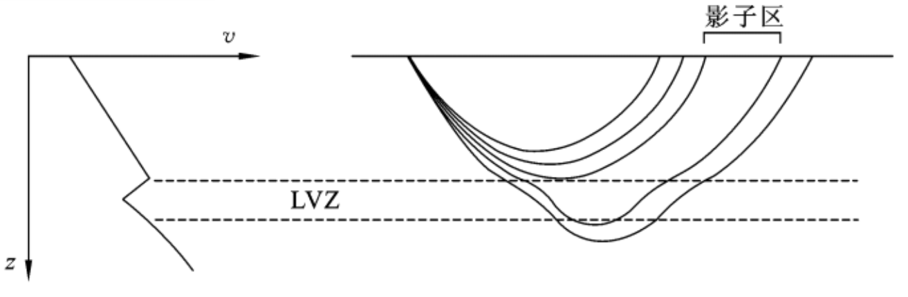 当射线进入一个速度比上层更慢的低速夹层时,走时曲线会产生间隙,即在一定距离范围内没有射线到达,这个区域被称为影区 (shadow zone)。