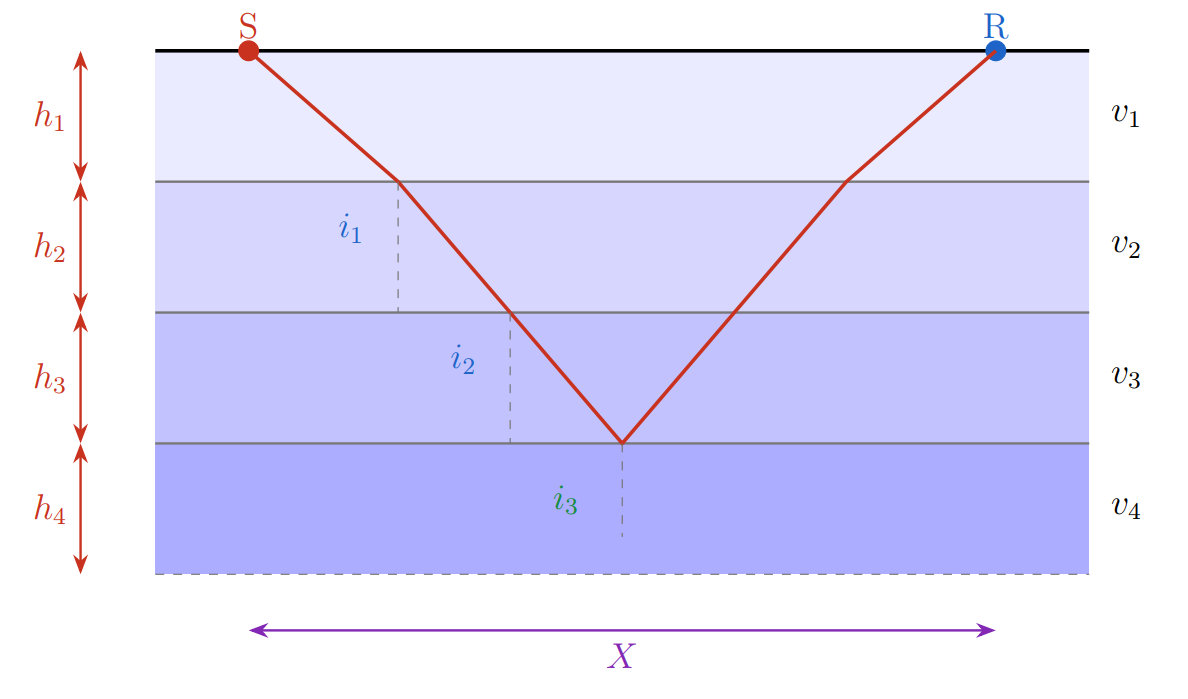 考虑地表震源,记 X 表示震中距,T 表示总走时。对于穿过 N 层的射线: