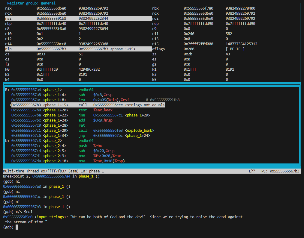 27c6: eb f4 jmp 27bc <phase_1+0x18>从汇编代码中可以看出,phase_1 函数调用了 strings_not_equal 函数来比较输入字符串和某个预设字符串是否相等。因此,我们只需要在执行 call strings_not_equal 之前,获取到 %rsi 指向的字符串即可。