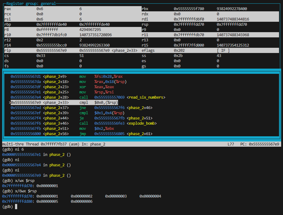 r完成这些之后,我们就可以直接运行 gdb bomb 来开始拆弹了。