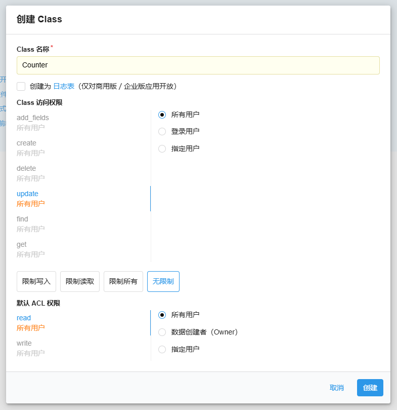 数据存储->结构化数据,点击创建 Class按钮,填写Class名称为Counter,选择无限制选项,点击创建按钮。