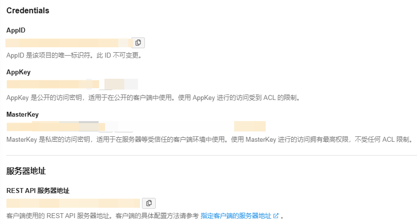 设置->应用凭证,记录下AppID、AppKey和REST API 服务器地址,供配置使用。